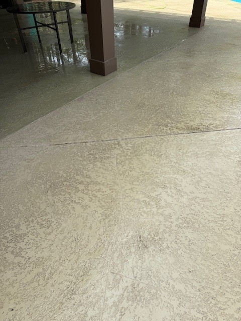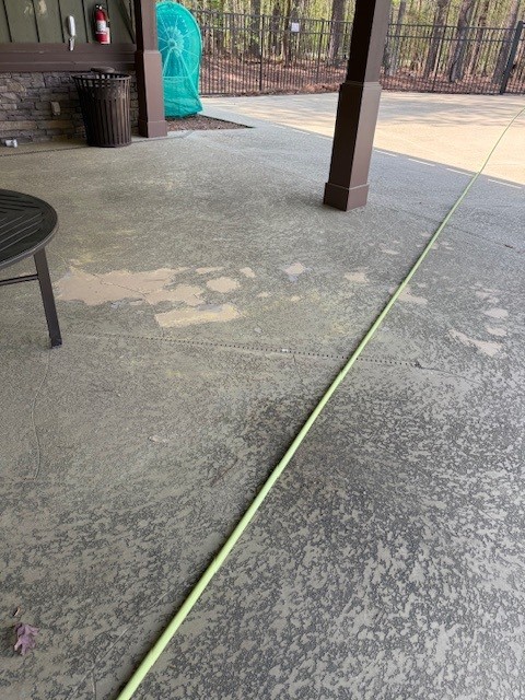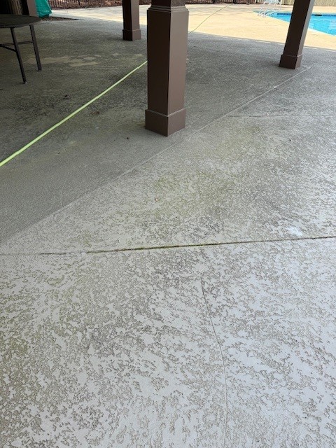 On arrival we inspected the area and explained our softwash process to the HOA representative. We used our softwash system to target the algae on the pool deck, applying cleaning solution at low pressure so we could remove the growth while protecting the cool decking around the pool. The goal was clear, remove all of the algae and preserve the deck material.